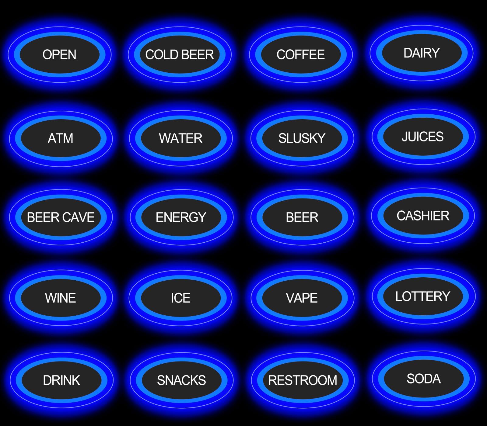 These signs go over the cooler doors where your drink products are. The size is 1x2' and they come in blue color with white letters.